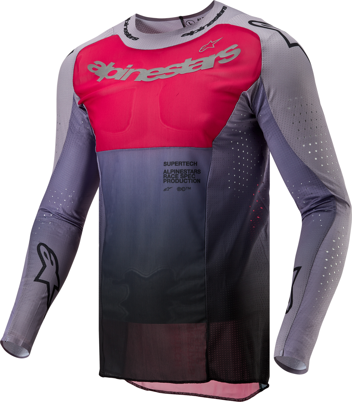 Supertech is Alpinestars innovative Motocross apparel line, designed for superior dirt riding performance. With an engineered design for an athletic fit, a chassis consisting entirely of advanced stretch mesh and an ultra-lightweight construction, the Supertech Jersey is Alpinestars lightest ever MX jersey. Featuring a host of race-proven technologies, the Supertech Jersey has innovative ergonomic shoulder and arm construction for superior freedom of movement and an extended back panel to maintain a flawless riding fit. Athletic, performance fit designed for aggressive riding and professional levels of movement, flexibility and comfort. Main material is engineered to be light, vented and stretchable, while also delivering superior durability. Moisture wicking fabric for optimized comfort. High airflow open mesh inserts on side and full back for optimum ventilation.