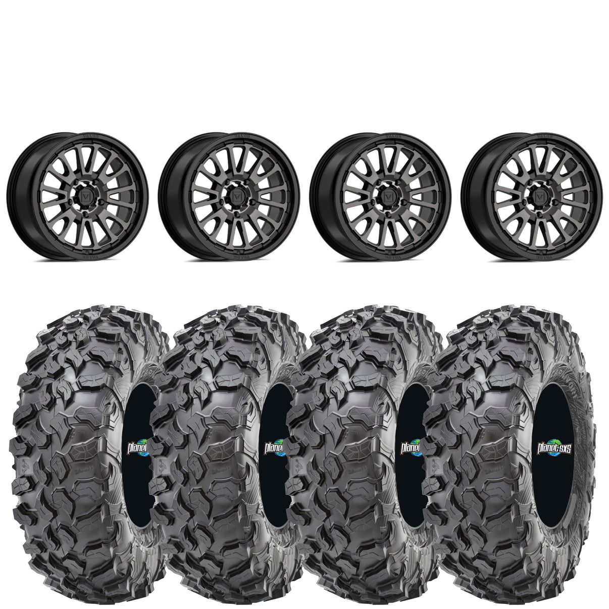 Get a set of (4) Valor Offroad V14 14x7/15x7 5+2 (+20mm) wheels mounted on 8-ply radial Maxxis Carnivore tires with vehicle specific lug nuts.