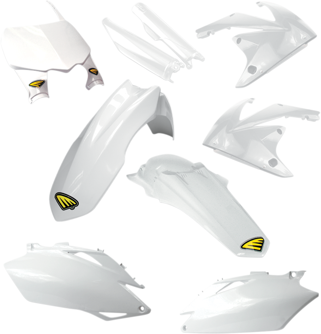 Upgrade your off-road experience with the CYCRA Body Kit - Powerflow in White (Part Number: 1CYC-9304-42). This comprehensive kit includes a performance front fender, stadium front number plate, Powerflow radiator shrouds, side panels, a Powerflow rear fender, and fork guards. Each component is injection-molded, ensuring a precise fit and finish that enhances both aesthetics and functionality. Made in the U.S.A., this body kit is designed to withstand the rigors of challenging terrains while providing a sleek look to your bike.