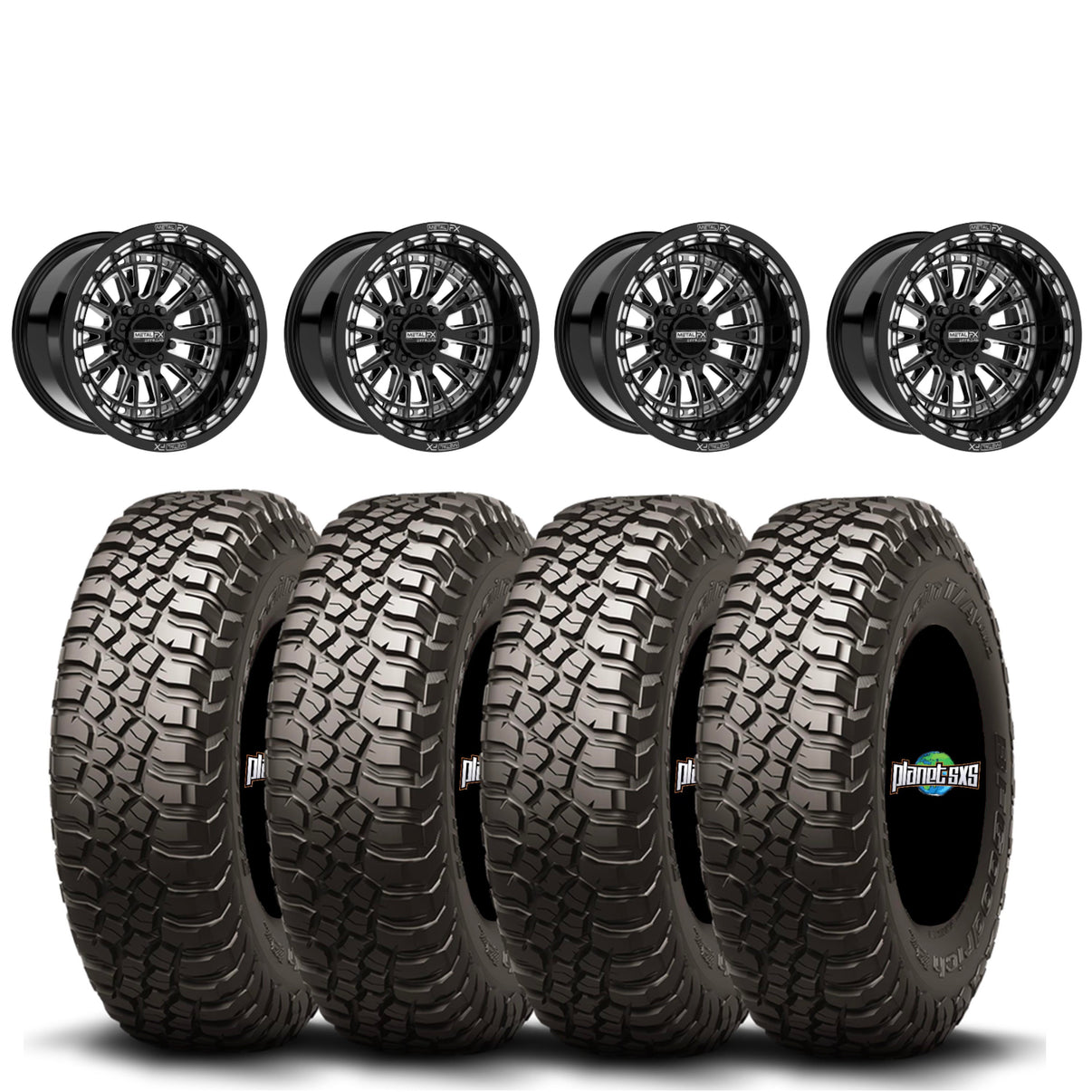 Get a set of (4) Gloss Black/Contrast Cut 5/4.5 15x8 4+4 Metal FX Slayer beadlocks mounted on 8 ply radial BFG KM3 tires with vehicle specific lug nuts included