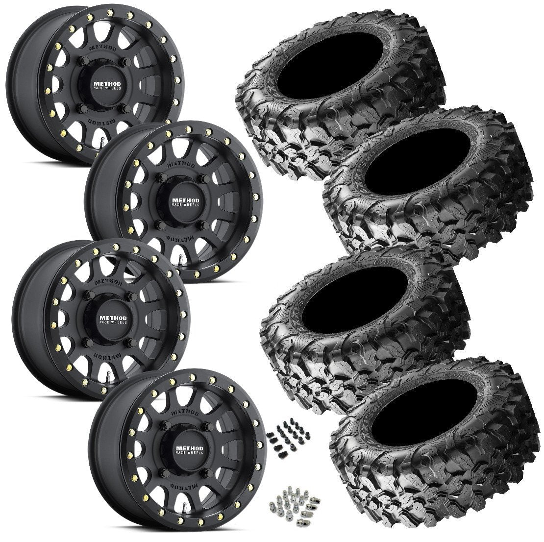 Race-proven wheels meet desert-dominating tires. This combo features the legendary Method 401 Beadlock wheels in Matte Black paired with aggressive Maxxis Carnivore 8-ply tires, delivering maximum grip, lightweight strength, and durability for serious UTV riders.