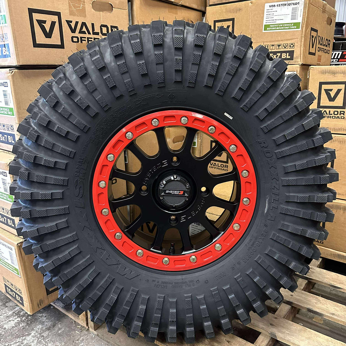 System 3 SB5 Beadlocks Matte Black w/ Custom Red rings mounted on Maxxis Roxxzillas