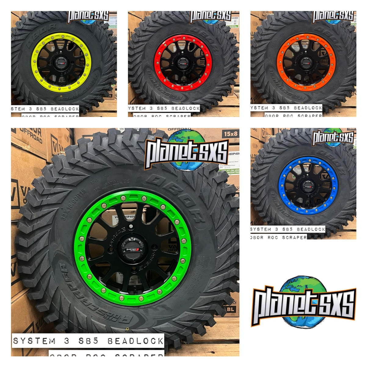 Get a set of (4) System 3 SB5 15x7 beadlocks with a 5+2 offset and your choice of beadlock ring color mounted on 8 ply radial Obor Roc Scrapers with...