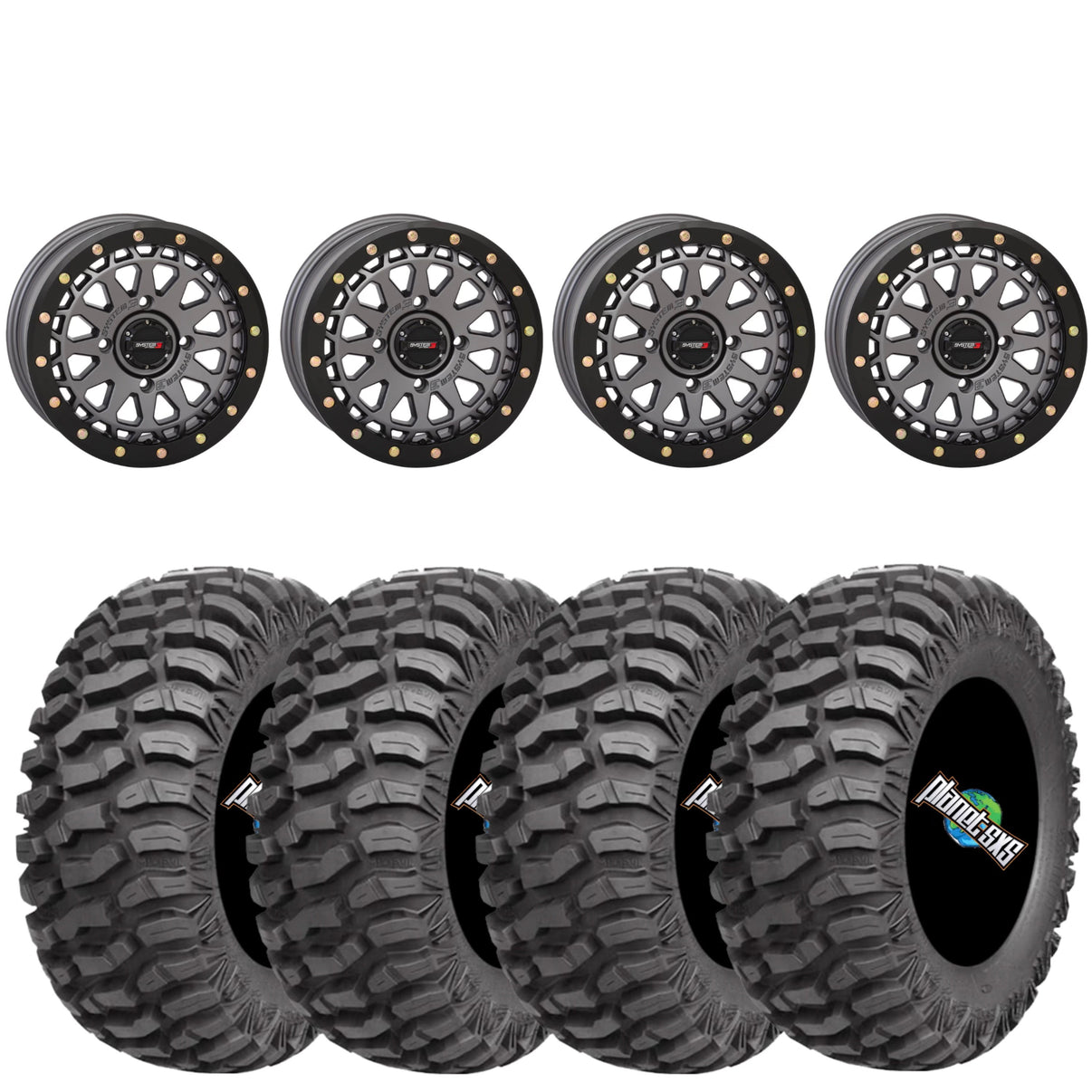 Get a set of (4) gunmetal System 3 SB6 beadlocks mounted on 8 ply radial AMS M1 Evil tires with vehicle specific lug nuts included