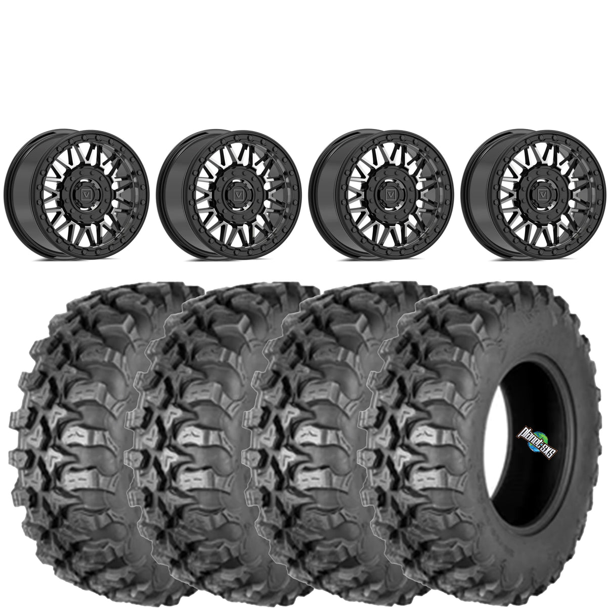 Get a set of (4) Valor V08 Dual drilled (4/137 and 4/156) 15x7 beadlocks with a 5+2 (+30mm) offset mounted on 8 ply radial QuadBoss QBT889 tires with vehicle specific lug nuts included