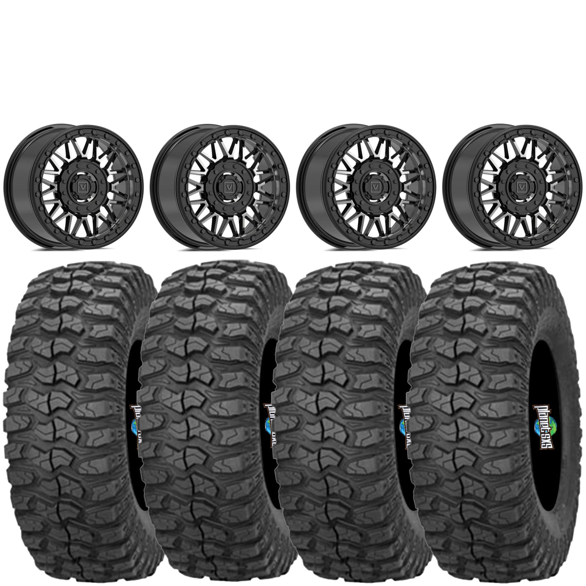 Get a set of (4) Valor V08 Dual drilled (4/137 and 4/156) 15x7 beadlocks with a 5+2 (+30mm) offset mounted on 8 ply radial Sedona Rock-A-Billy tires with vehicle specific lug nuts included
