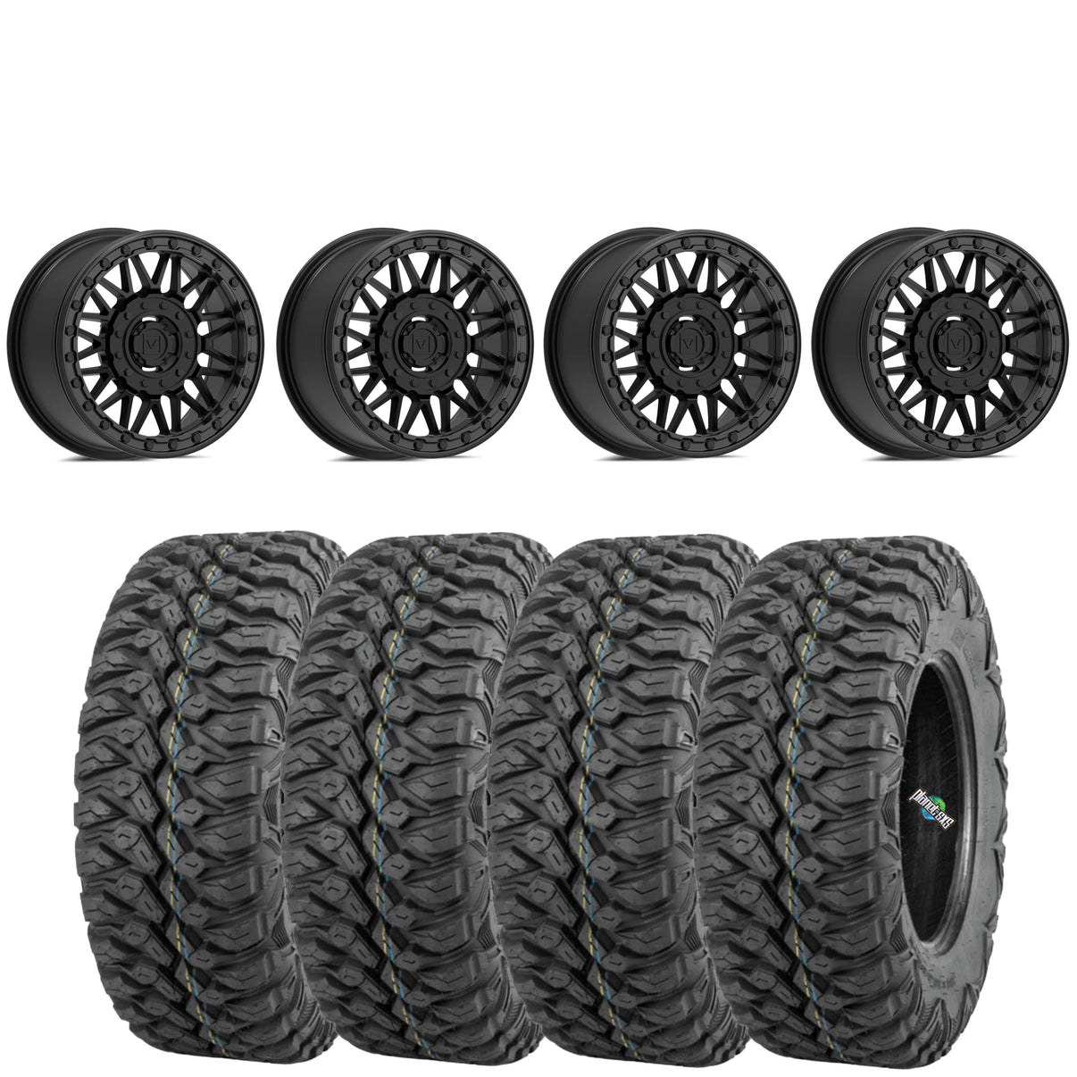 Get a set of (4) Valor V08 Dual drilled (4/137 and 4/156) 15x7 beadlocks with a 5+2 (+30mm) offset mounted on 8 ply radial QuadBoss QBT846 tires with vehicle specific...