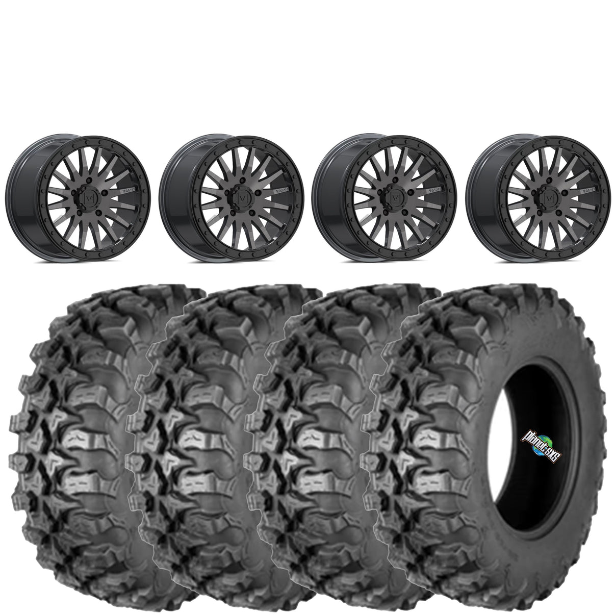 Get a set of (4) 15x8 5/4.5 Valor Offroad V06 beadlocks with a 6+2 (+40mm) offset mounted on 8 ply rated radial QuadBoss QBT889 tires with vehicle specific lug nuts...