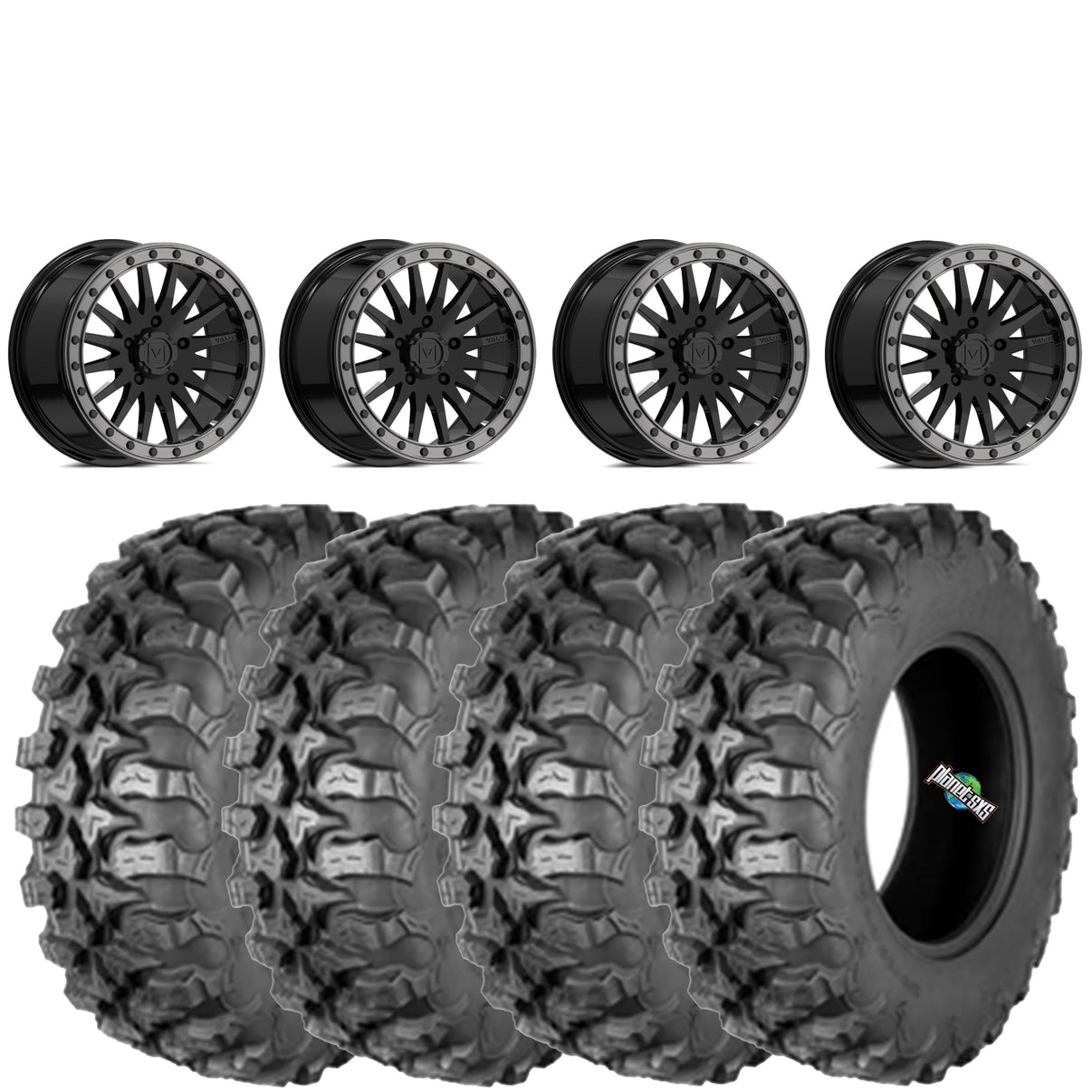 Get a set of (4) 15x8 5/4.5 Valor Offroad V06 beadlocks with a 6+2 (+40mm) offset mounted on 8 ply rated radial QuadBoss QBT889 tires with vehicle specific lug nuts...