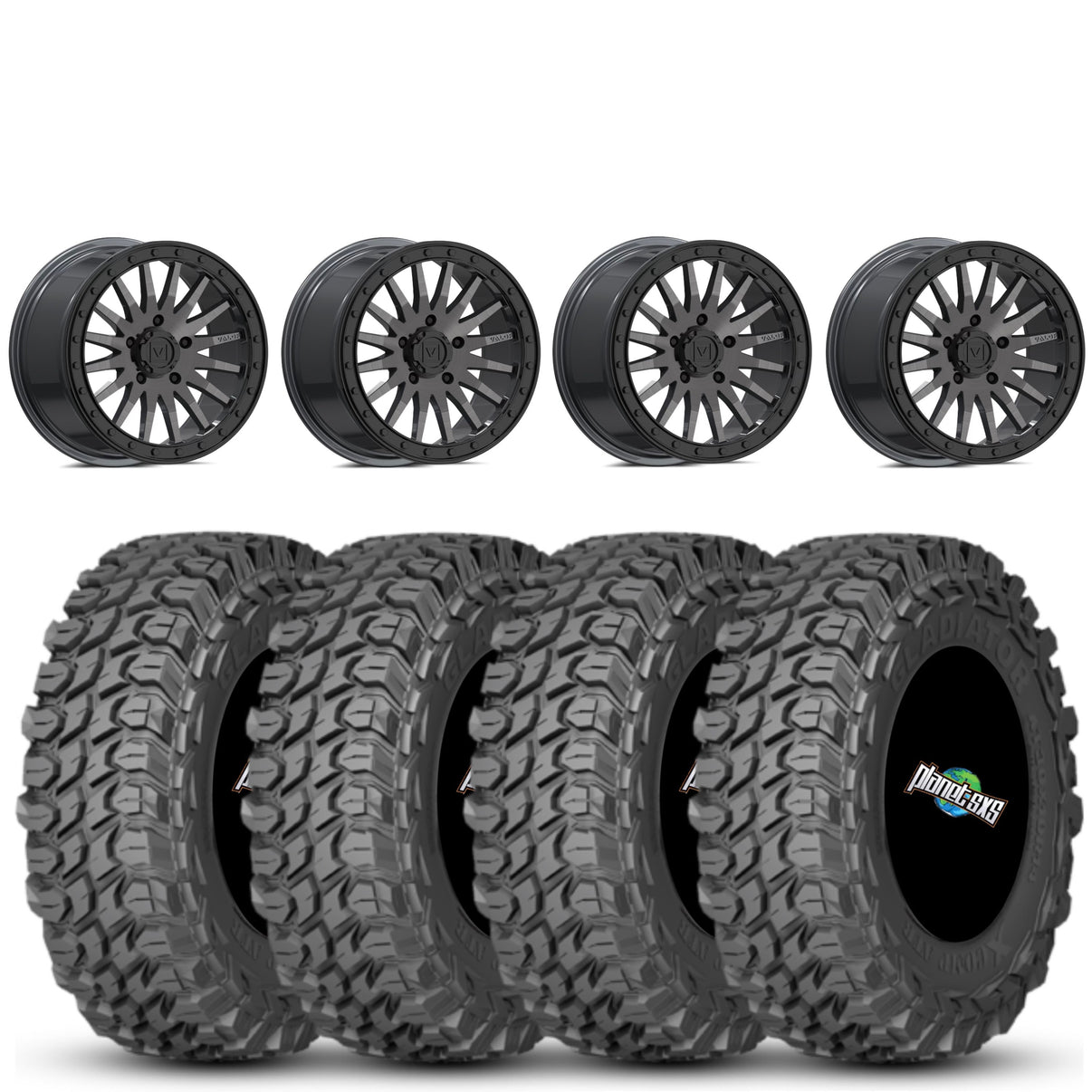 Get a set of (4) 15x8 5/4.5 6+2 (+40mm) offset Valor V06 beadlocks mounted on 10 ply rated Gladiator XComp tires with vehicle specific lug nuts