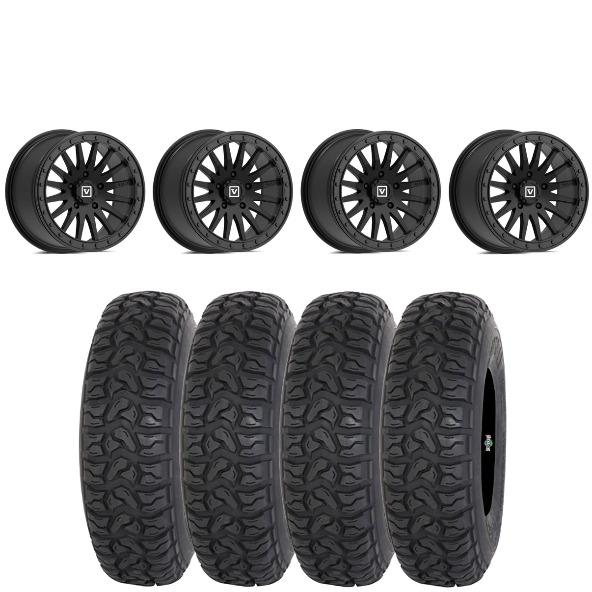 Get a set of (4) Valor V06 15X7 5/4.5 beadlocks in a 6+2 (+40mm) offset mounted on 8 ply rated radial Highlifer Chicane LT tires with vehicle specific lug nuts...