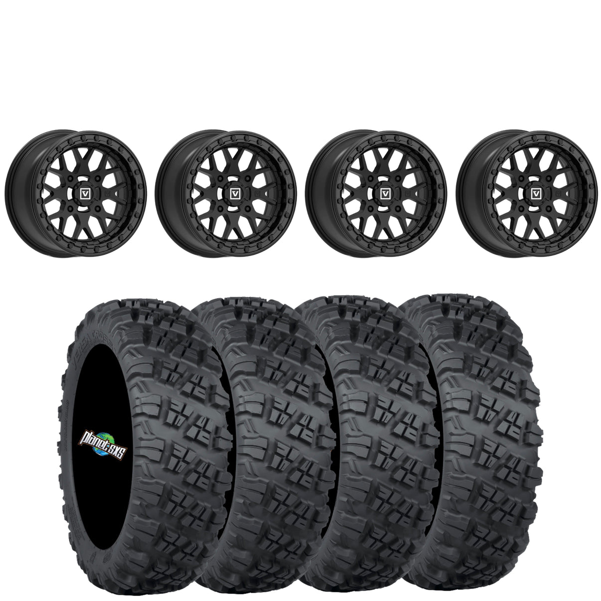 Get a set of (4) Valor Offroad V07 15x7 5+2 (+25mm) beadlocks mounted on 8-ply radial ITP Versa Cross tires with vehicle specific lug nuts.