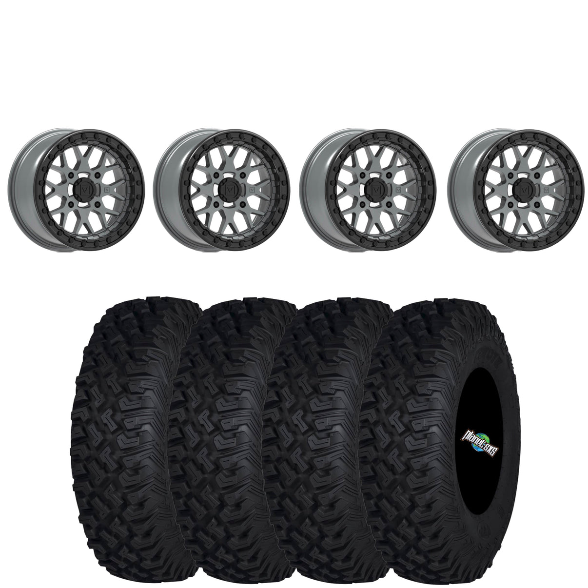 Get a set of (4) Valor Offroad V07 15x7 5+2 (+25mm) beadlocks mounted on 8-ply radial ITP Coyote tires with vehicle specific lug nuts.