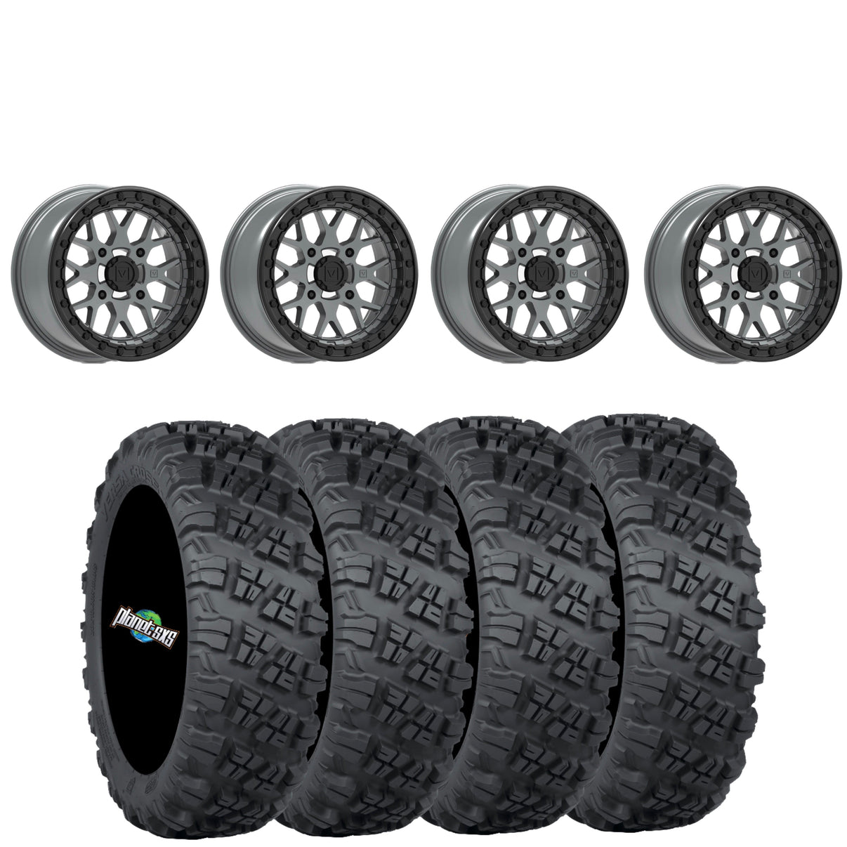 Get a set of (4) Valor Offroad V07 15x7 5+2 (+25mm) beadlocks mounted on 8-ply radial ITP Versa Cross tires with vehicle specific lug nuts.