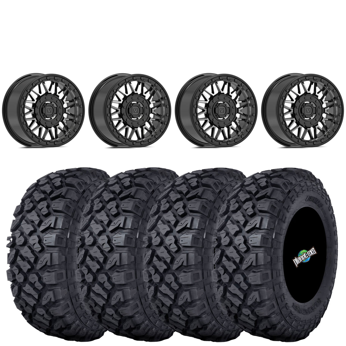 Get a set of (4) Valor V08 Dual drilled (4/137 and 4/156) 15x7 beadlocks with a 5+2 (+30mm) offset mounted on 8 ply steel belted radial Kenda Klever tires with vehicle specific lug nuts included