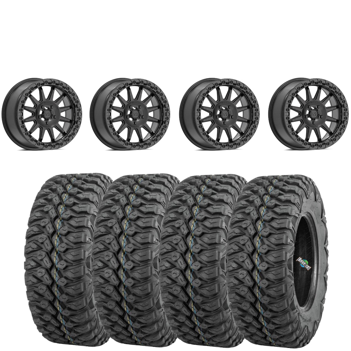 Get a set of (4) Valor Offroad V09 15x7 5+2 (+40mm) beadlocks mounted on 8-ply radial Quadboss QBT846 tires with vehicle specific lug nuts.