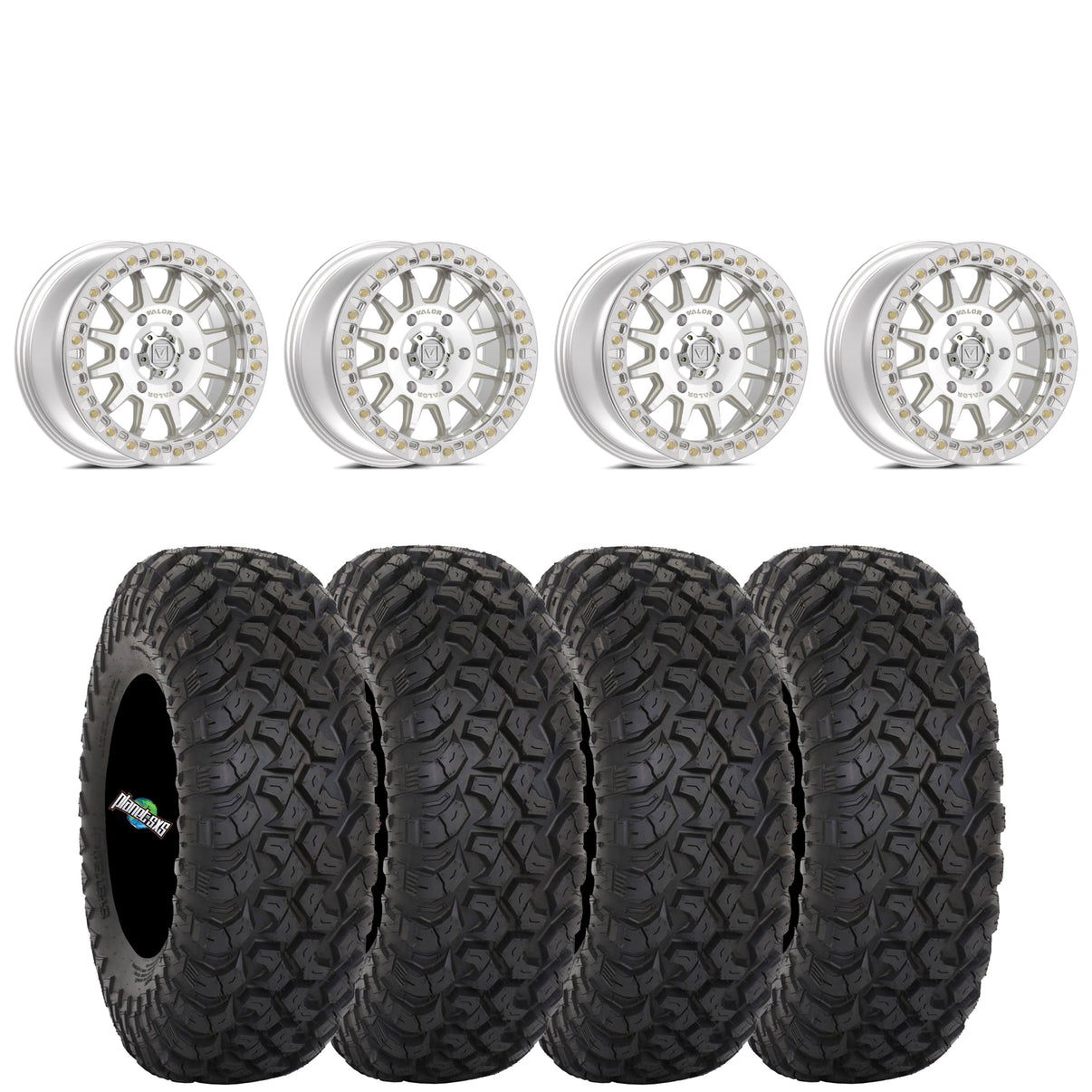 Get a set of (4) Valor Offroad V09 15x7 5+2 (+40mm) beadlocks mounted on 8-ply radial System 3 RT320 tires with vehicle specific lug nuts.
