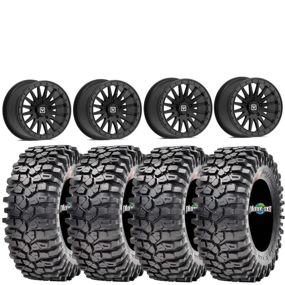 Valor V06 Beadlock Wheels + Maxxis Roxxzilla Tires (Mounted Kit) – 15x8 | Fits UTVs with 5/4.5 Bolt Pattern