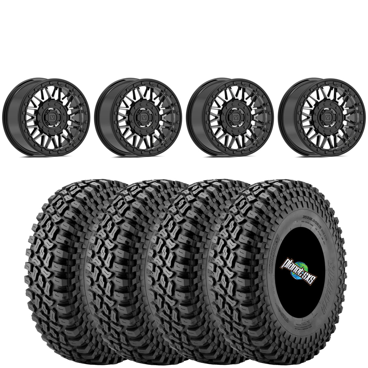 Get a set of (4) Valor V08 Dual drilled (4/137 and 4/156) 15x7 beadlocks with a 5+2 (+30mm) offset mounted on 8 ply rated Super ATV Incursion tires with vehicle specific lug nuts included