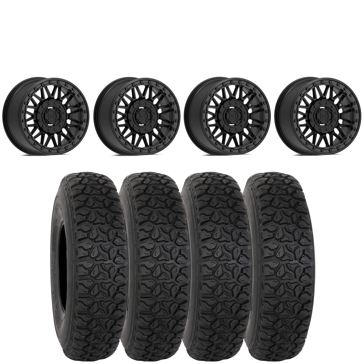 Get a set of (4) Valor V08 Dual drilled (4/137 and 4/156) 15x7 beadlocks with a 5+2 (+30mm) offset mounted on 8 ply rated System 3 DX440 tires with vehicle specific lug nuts included